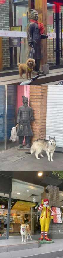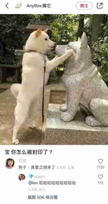 当狗子遇上狗狗雕像。